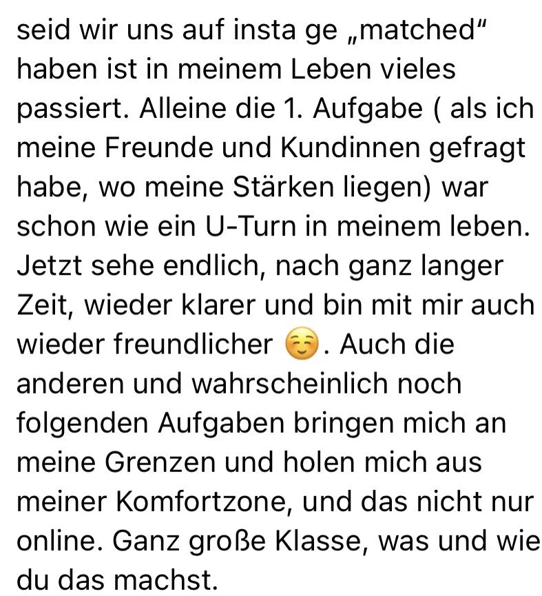 Deine Positionierung wird eindeutig, deine Angebote werden stimmig, deine Formate, deine Sprache und dein Auftritt greifen ineinander – weil sie aus dir heraus wachsen.